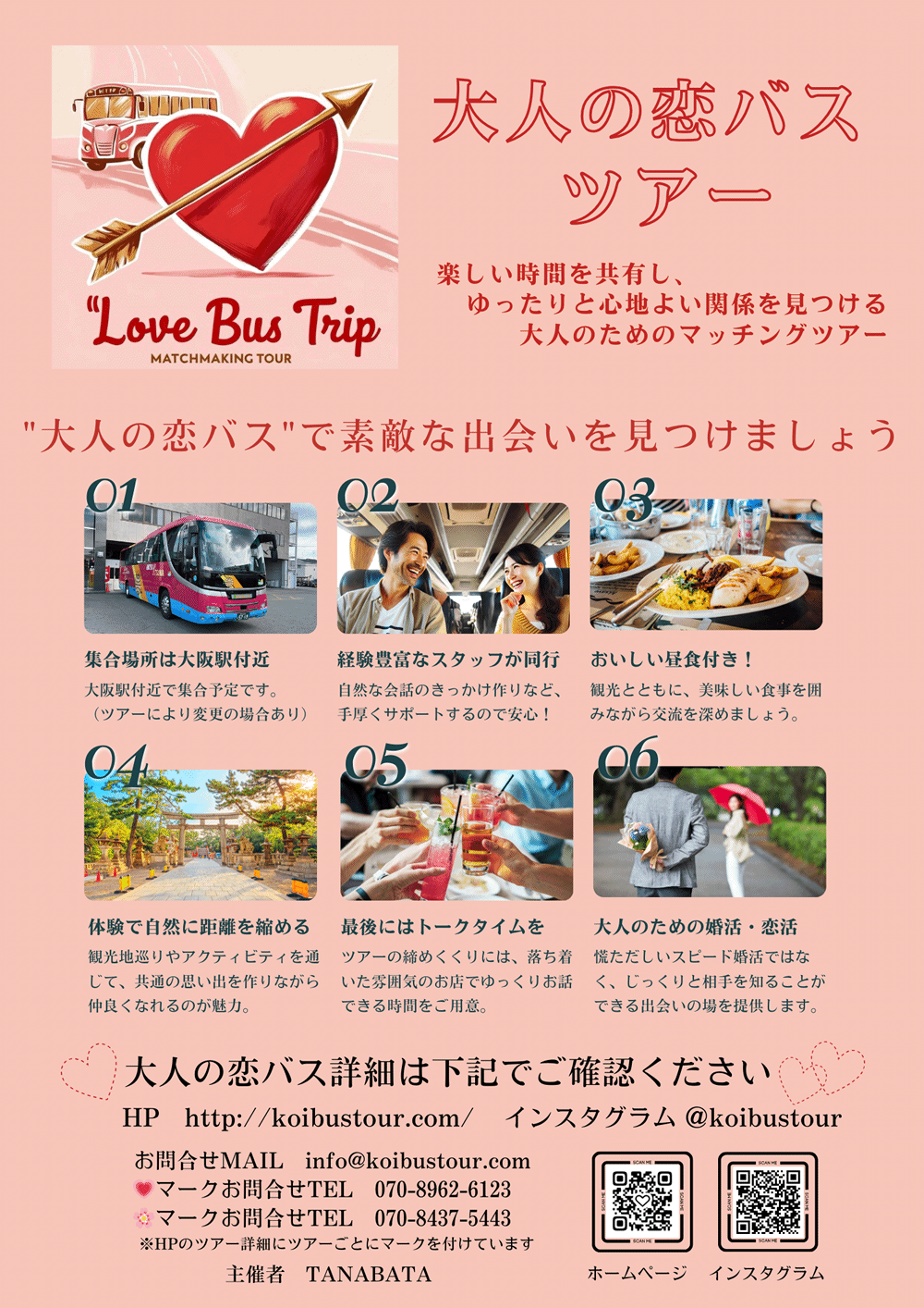 2025年3月13日 / 最終更新日時 : 2025年10月20日 jenovatravel.com トピックス 大人の恋バスツアー お問い合わせ先(たなばた旅行) 特設サイト http://koibustour.com/インスタグラム https://www.instagram.com/koibustour FacebookXBluesky